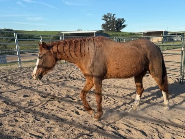 In mid-January we received an emergency call from another rescue to see if we had the room and resources to take on this little old lady. The worst body score condition we had ever laid eyes on… From a front yard in downtown Sacramento stood an emaciated older sorrel mare, tied to a tree with a piece of what looked like Romex (yes the kind of wire one would use for wiring a house…) let that sink in. She had been there a week before a neighbor (thank you good neighbor 🙏🏽) had called animal control for some help on this issue of neglect.